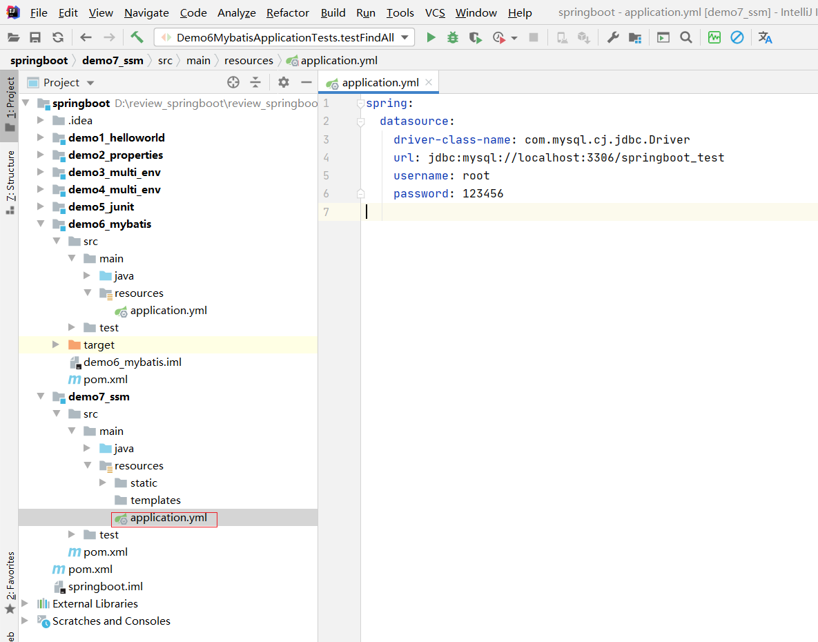 spring:datasource:driver-class-name: com.mysql.cj.jdbc.Driverurl: jdbc:mysql://localhost:3306/springboot_testusername: rootpassword: 123456