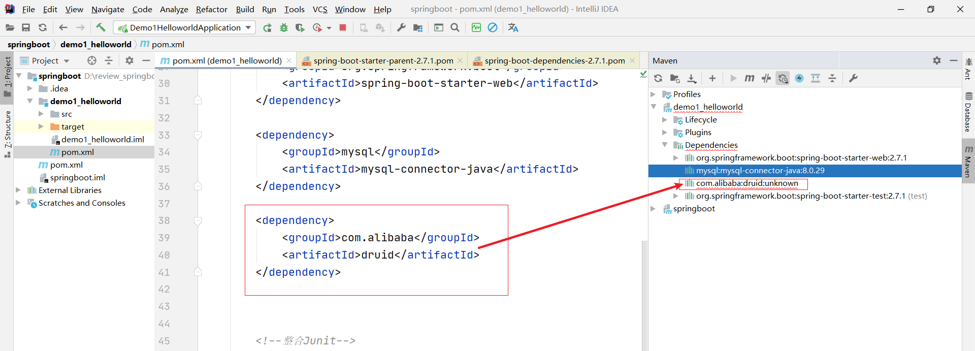 com.alibaba druid 1.2.8 如果不写版本号的话 就会出现unknown 这个时候 我们就知道在springboot的父亲的父亲里面并没有管理这个依赖 这个时候 我们就能自己添加版本号