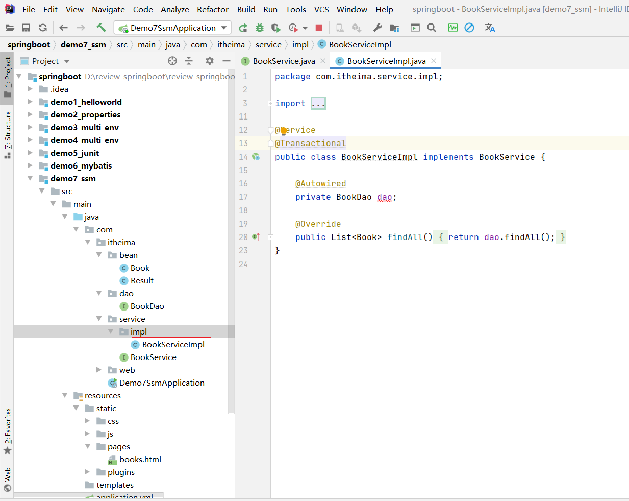 public class BookServiceImpl implements BookService {@Autowiredprivate BookDao dao;@Overridepublic List findAll() {return dao.findAll();}
