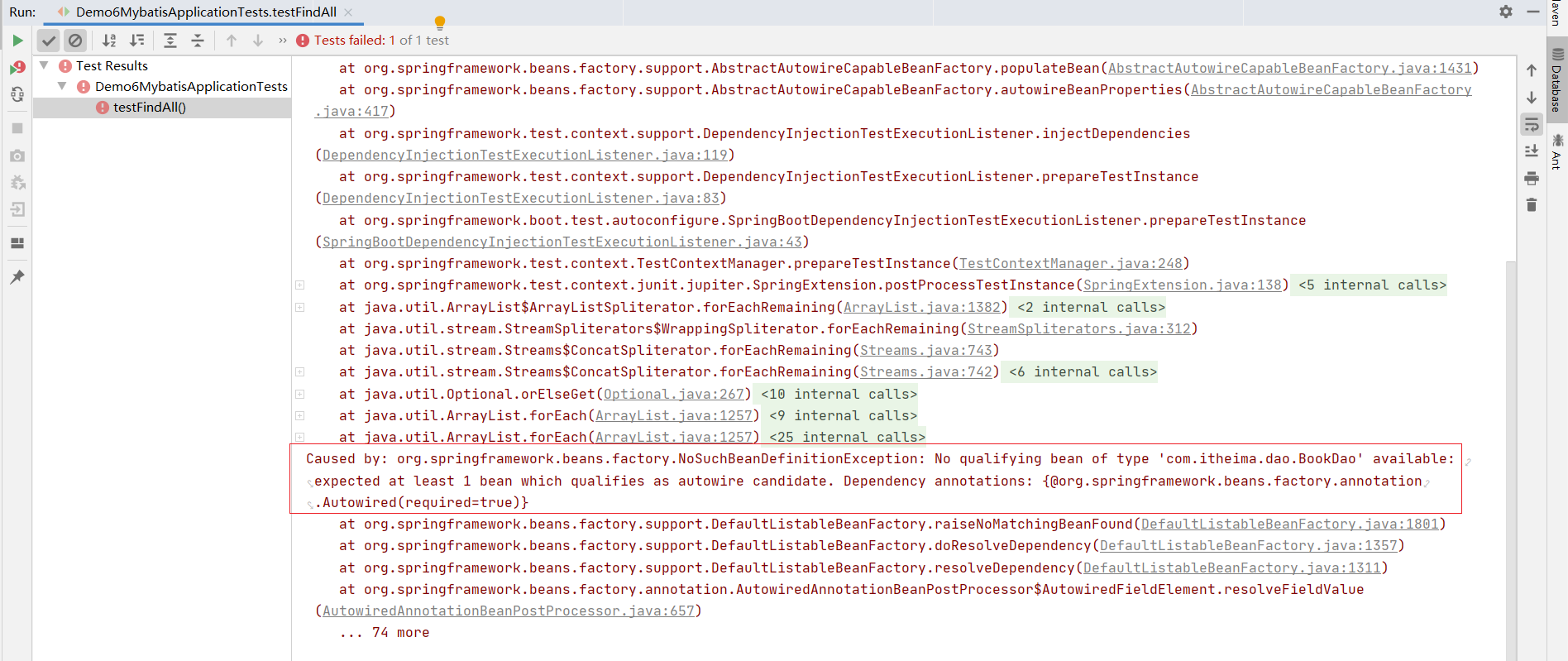 Caused by: org.springframework.beans.factory.NoSuchBeanDefinitionException: No qualifying bean of type 'com.itheima.dao.BookDao' available: expected at least 1 bean which qualifies as autowire candidate. Dependency annotations: {@org.springframework.beans.factory.annotation.Autowired(required=true)}