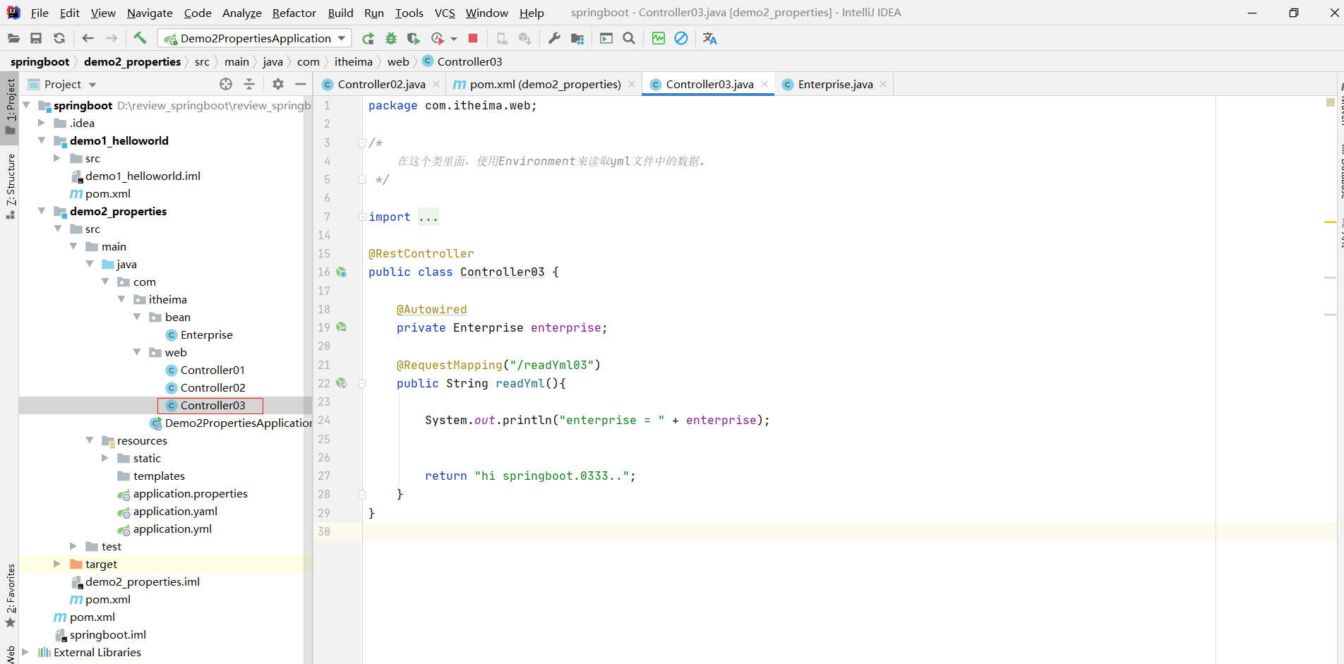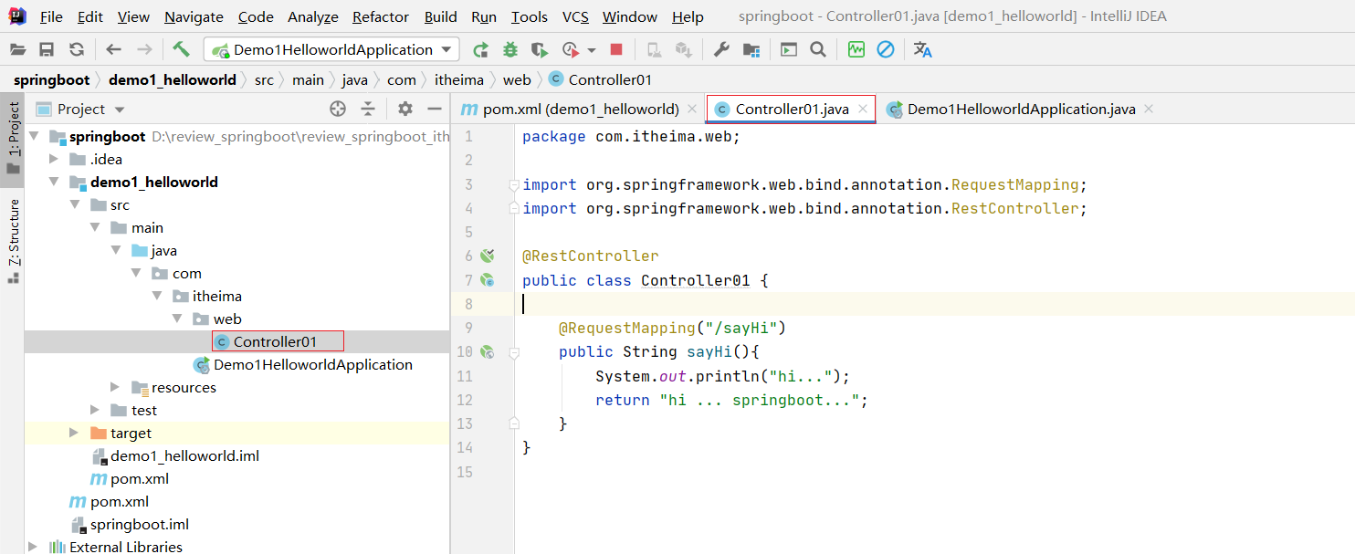 public class Controller01 {@RequestMapping("/sayHi")public String sayHi(){System.out.println("hi...");return "hi ... springboot...";}