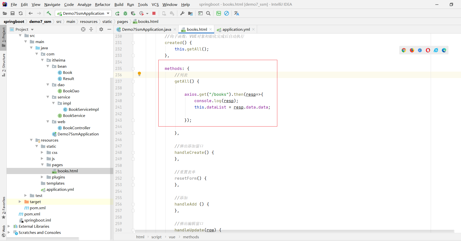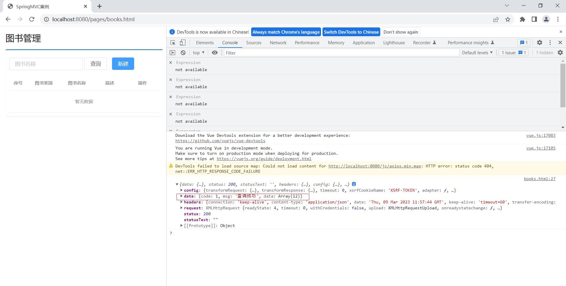 methods: {//列表getAll() {axios.get("/books").then(resp=>{console.log(resp);//this.dataList = resp.data.data;});