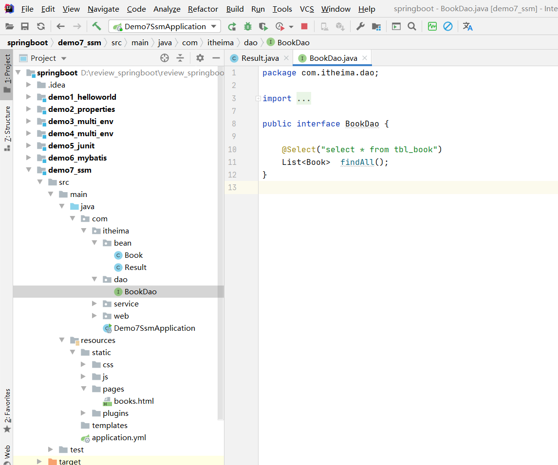 import org.apache.ibatis.annotations.Select;import java.util.List;public interface BookDao {@Select("select * from tbl_book")List findAll();