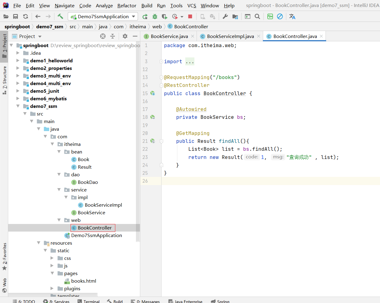 public class BookController {@Autowiredprivate BookService bs;@GetMappingpublic Result findAll(){List list = bs.findAll();return new Result(1, "查询成功" , list);}
