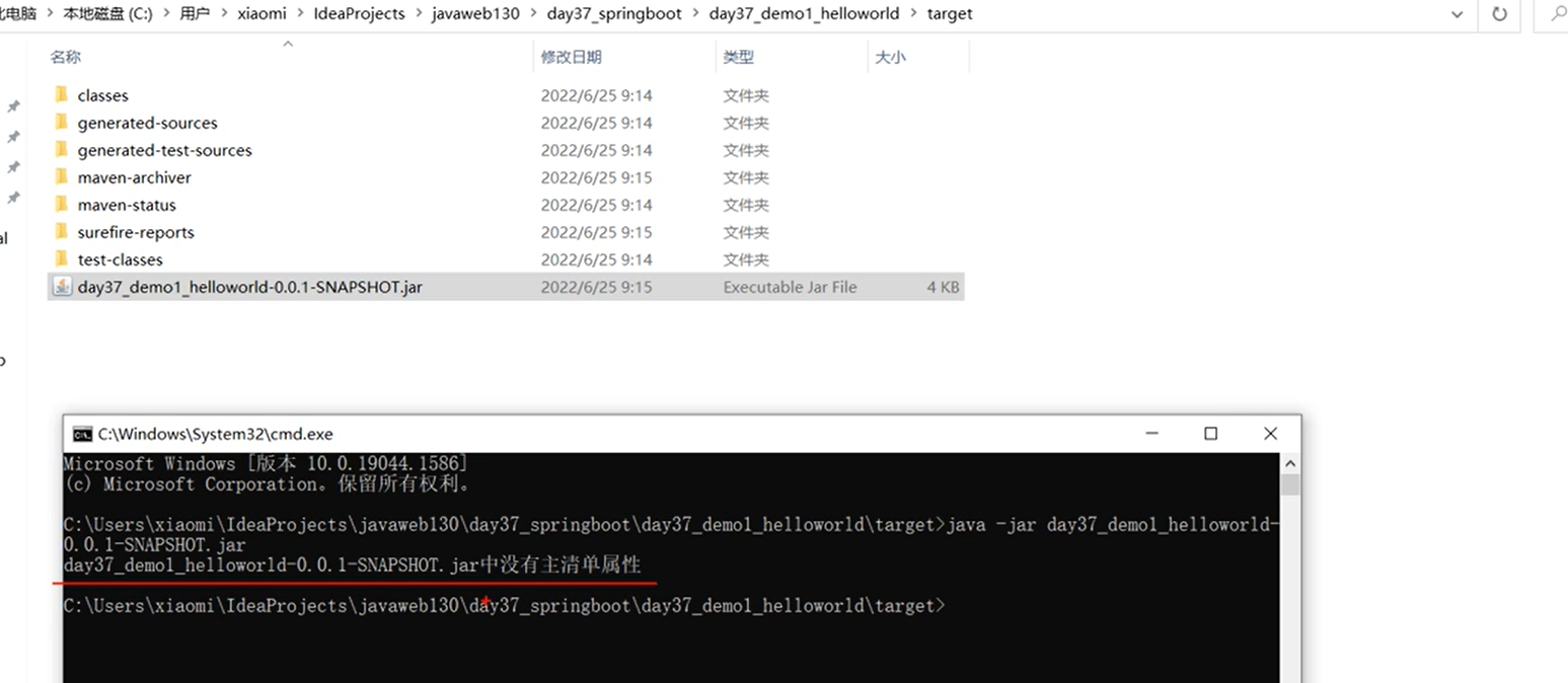 jar支持命令行启动需要依赖maven插件支持,请确认打包时是否具有SpringBoot对应的maven插件。