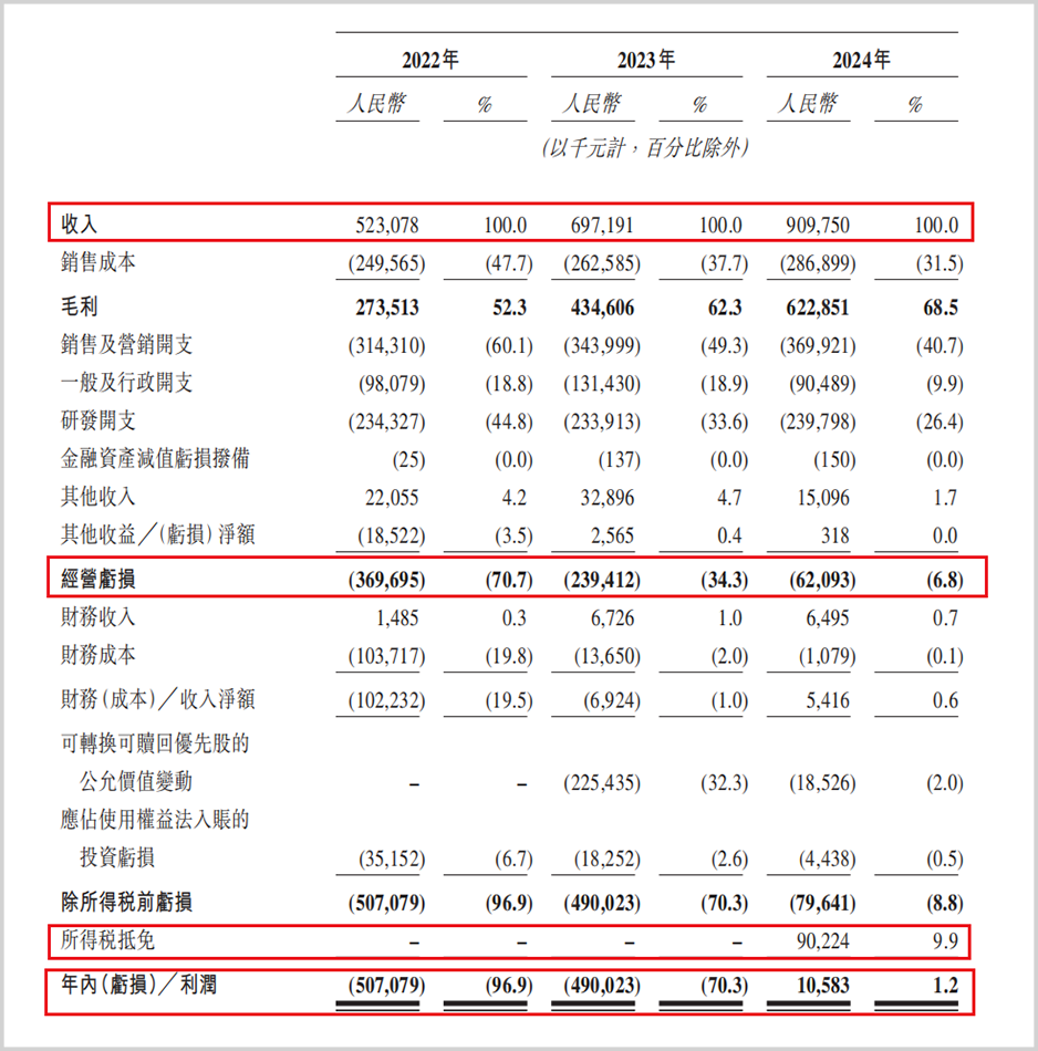 招股书显示,2022至2024年(简称报告期),公司的总收入分别为5.23亿元、6.97亿元和9.10亿元,整体增长74%左右。而同期净利润分别为-5.07亿元、-4.90亿元和0.11亿元,2024年首次实现账面盈利。但是其盈利质量并不高,存在着粉饰报表之嫌。