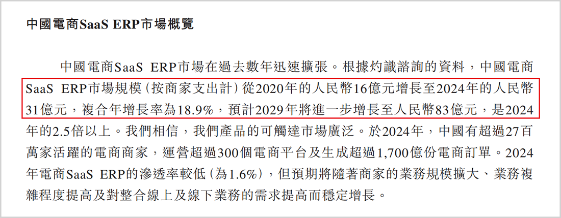 招股书中提到,2024年中国整体的电商SaaS ERP市场的规模仅为31亿元,即便是保持着18.9%的年复合增速,到2029年其市场规模也仅有83亿元,而这也就引发了市场投资者对于行业规模过小和头部企业增长空间受限的顾虑。