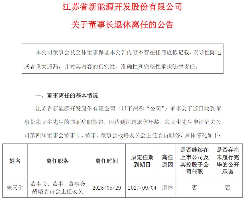 公告显示,江苏新能董事会近日收到董事长朱又生的书面辞职报告,因达到法定退休年龄,朱又生申请辞去公司第四届董事会董事长、董事、董事会战略委员会主任委员职务。