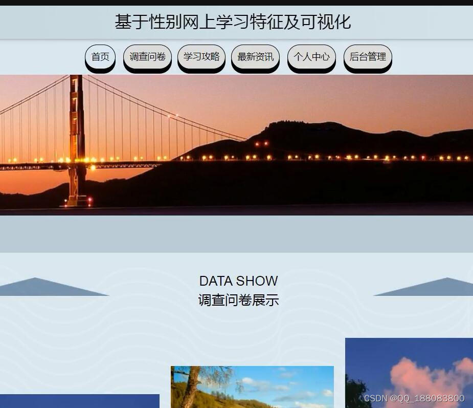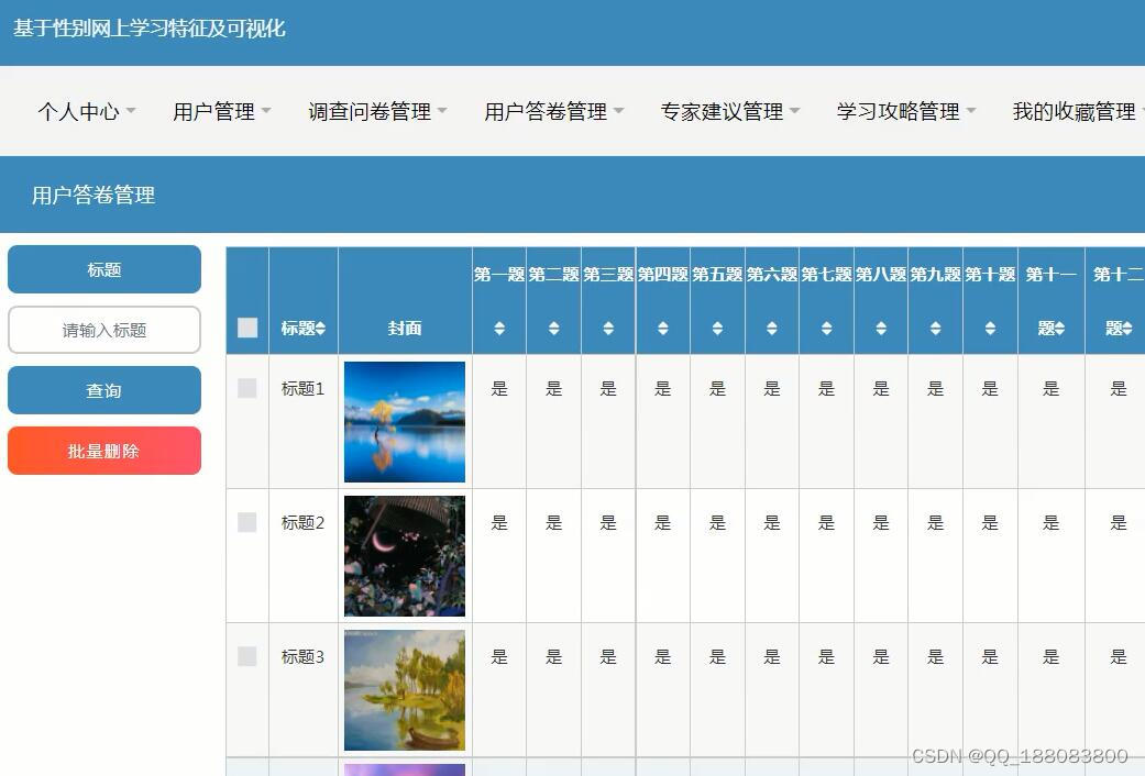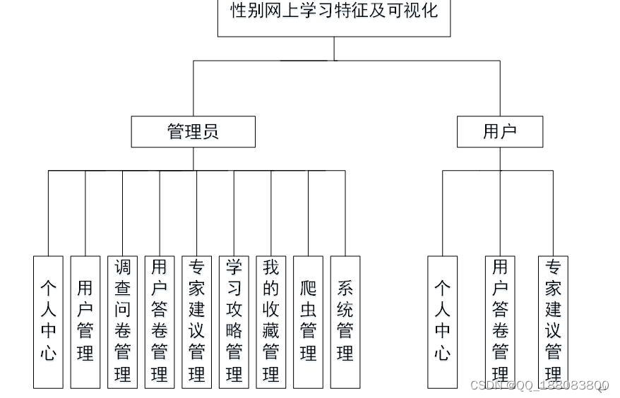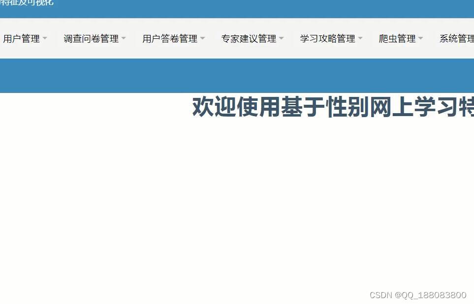 基于JSP技术、springboot框架、B/S机构、Mysql数据库设计并实现了性别网上学习特征及可视化。系统主要包括个人中心、用户管理、调查问卷管理、用户答卷管理、专家建议管理、学习攻略