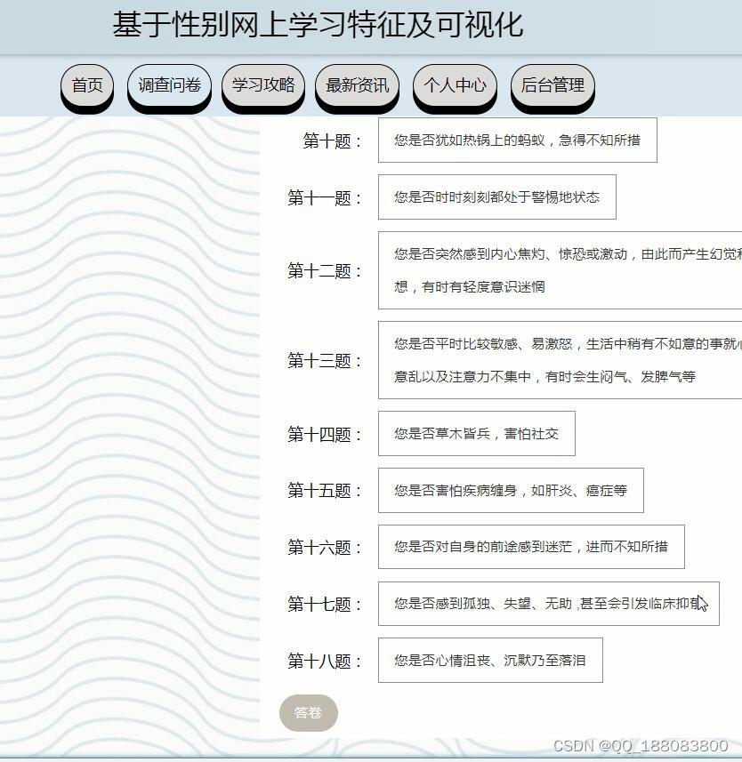 主要对个人中心、用户管理、调查问卷管理、用户答卷管理、专家建议管理、学习攻略管理、我的收藏管理、爬虫管理、系统管理的实现。
