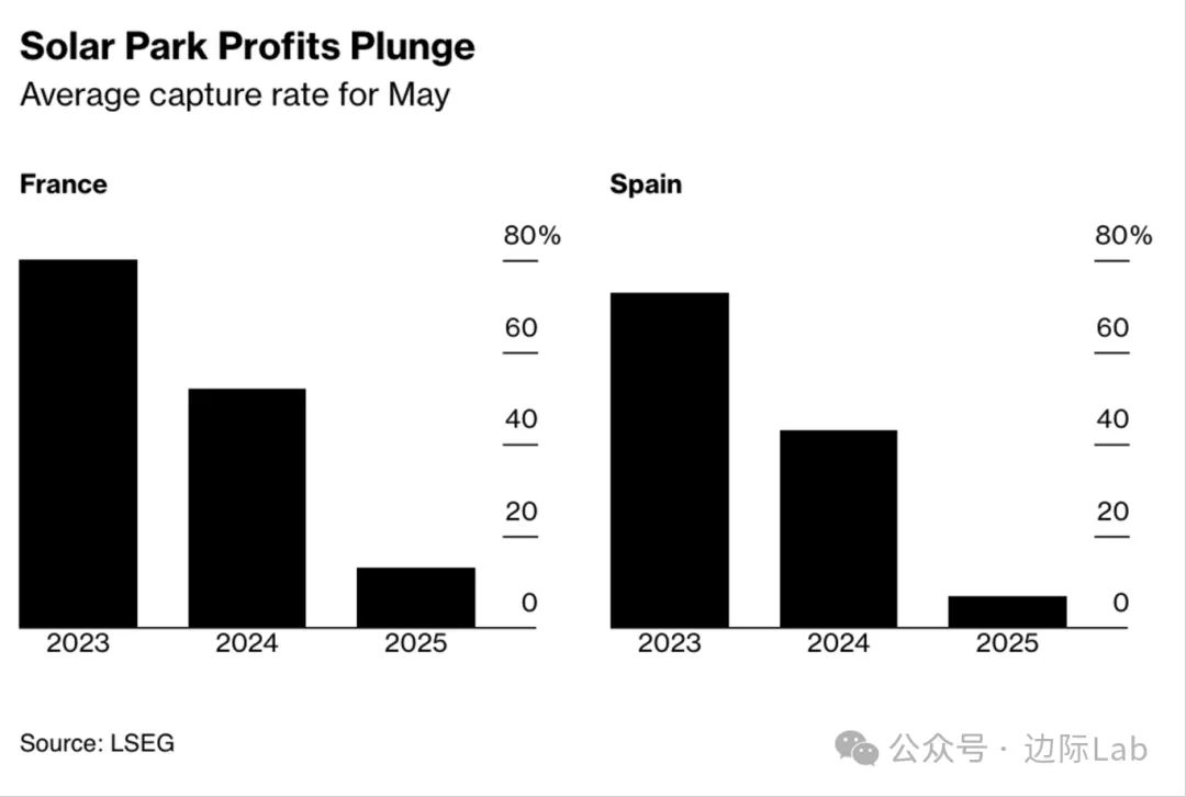 3.在新增产能大量并网、电价在高发电时段下跌的背景下,法国和西班牙光伏电站利润大幅缩水。LSEG数据显示,2025年5月,西班牙光伏“捕获率”降至7%,法国为13%,均创历史新低,远低于去年同期的43%和48%。捕获率是指太阳能发电商在市场中实际卖出电力的平均价格相对于市场平均电价的比值,反映其能在高电价时段获得收益的能力。当前光照条件充足叠加装机过快增长,令供需失衡加剧,电价在发电高峰期大幅走低,从而压缩项目盈利。