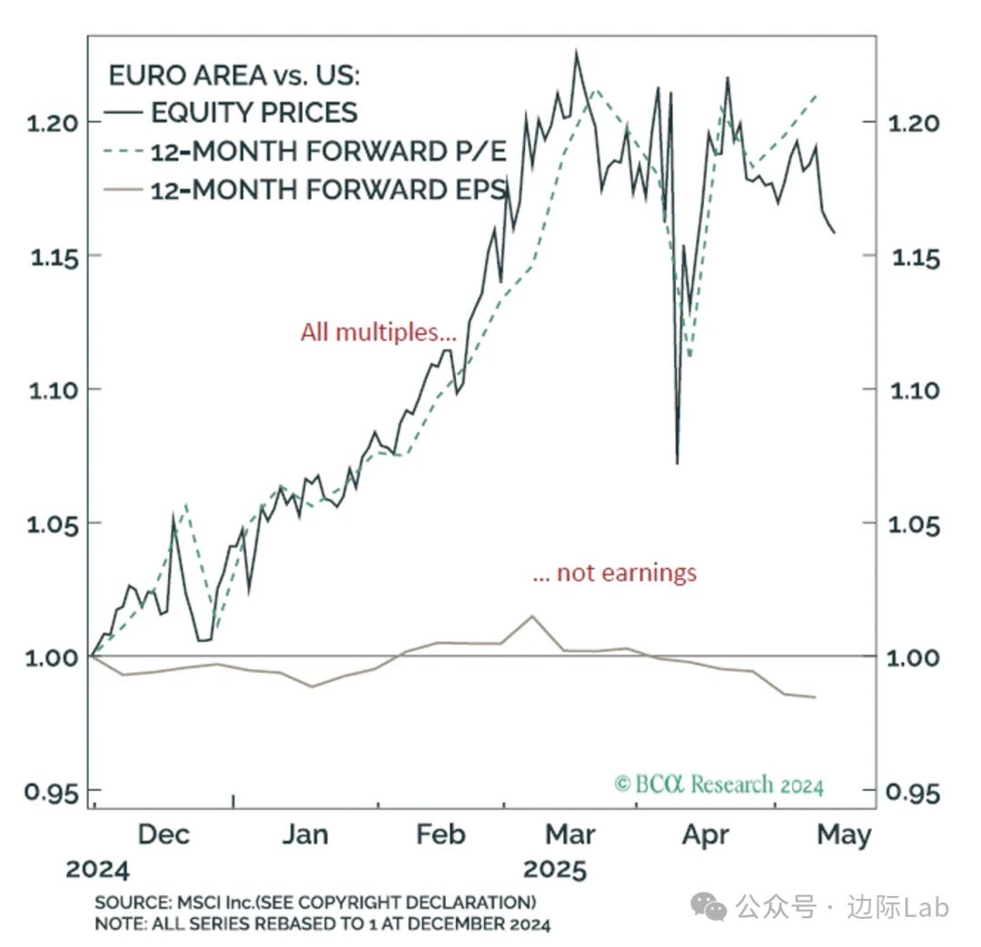 1.自2024年末以来,欧元区相较美国股市的超额表现主要源于估值上升(远期市盈率上行),而非盈利增长(EPS预期增速基本持平)。这意味着,欧洲股市这轮上涨更多依赖市场对政策与增长前景的乐观预期,而非基本面支撑。