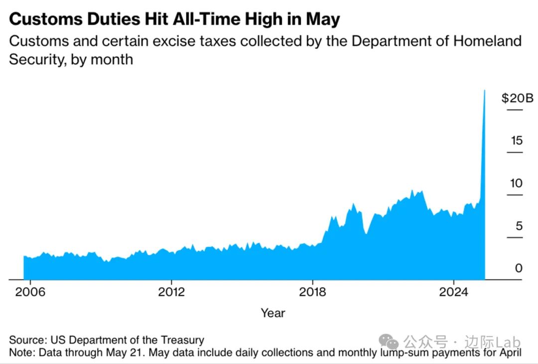 2.美国财政部数据显示,随着特朗普政府新一轮普遍性关税首次全面生效,2025年4月美国关税收入创下165亿美元的月度新高。由于约三分之二的进口商在货物抵达美国港口后一个月内缴税,4月数据体现的是3月实施的新关税影响。但是,尽管收入激增,距离特朗普设定的“每天20亿美元”关税目标仍有明显差距。当前主要关税包括对大多数国家商品征收10%的基本关税、对钢铝征收25%、对汽车征收25%。