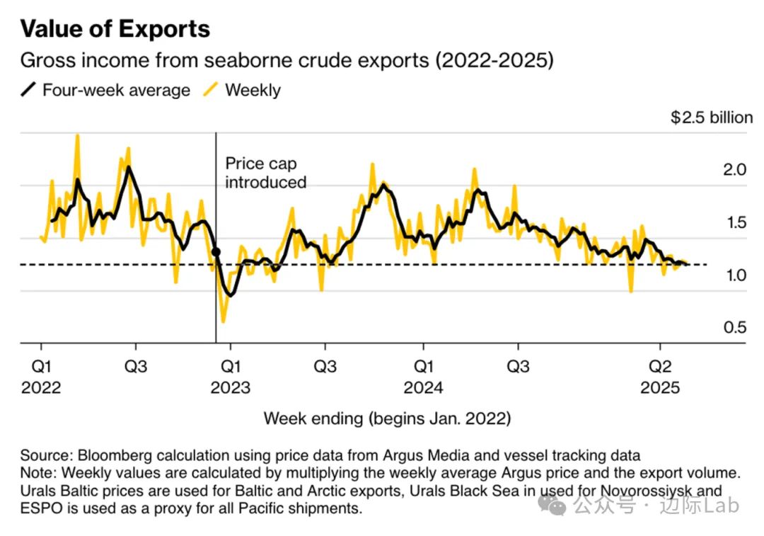 3.截至2025年5月25日的四周内,俄罗斯海运原油出口总收入降至自2023年4月以来最低水平。该期间俄原油出口日均为339万桶,仅较前期减少1万桶,但由于油价下跌,出口总值明显回落。自2024年4月中旬以来,俄油周度出口收入已累计下滑28%,出货量减少约8%。
