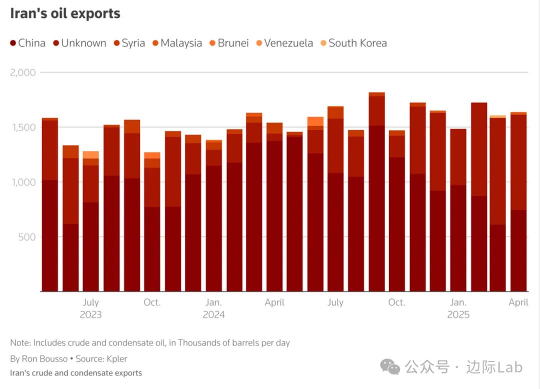 4.尽管中国官方未记录从伊朗的原油进口,但Kpler数据显示,2024年中国实际吸收了伊朗原油出口量的77%。2025年,中国占比降至约50%,因美国加强了对伊朗部分地炼和港口的制裁。目前,伊朗海上浮仓原油激增至2023年11月以来最高水平,若美国制裁放松,这部分原油将迅速投放市场。