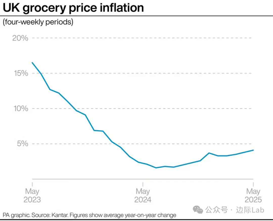 Kantar数据显示,截至5月18日的四周,英国食品杂货价格同比上涨4.1%,为自2024年2月以来最高,凸显生活成本压力再度加剧。在家庭账单普遍上涨的背景下,食品通胀反弹可能对消费支出构成抑制,增加英国央行在货币政策上的权衡难度。
