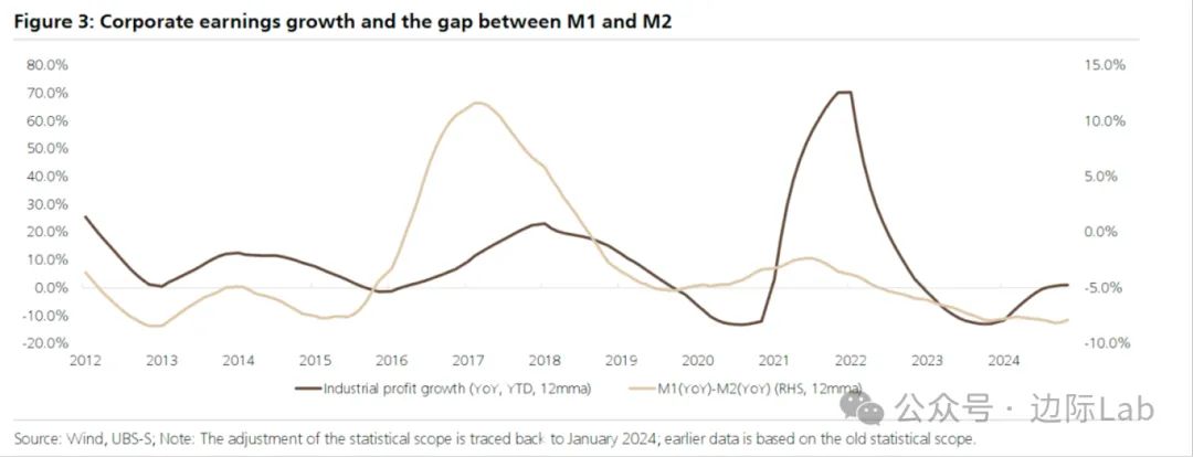 2.瑞银指出,中国企业盈利增速与M1-M2剪刀差高度相关,且剪刀差往往领先利润变化。M1增速快于M2意味着企业倾向将资金从定期转为活期以备支出,资金活性增强,通常预示盈利改善与投资意愿回升。