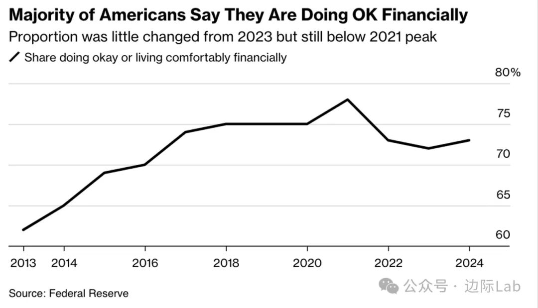 4.美联储最新家庭经济状况调查显示,截至2024年10月,73%的美国成年人认为自己“经济状况尚可或生活舒适”,与2023年(72%)基本持平,但仍低于2021年的78%。63%受访者表示可用现金或等值方式应对400美元紧急开支。物价上涨和住房负担依然是主要压力来源,尤其食品和租金。债务偿付压力上升,“先买后付”类分期付款逾期比例从2023年的18%升至近25%。此外,仅62%的跳槽者认为新工作“总体更好”,低于2022年高点的72%,显示劳动力市场信心有所回落。另外,认为经济“良好或优秀”的人仅占29%,远低于疫情前2019年的50%。