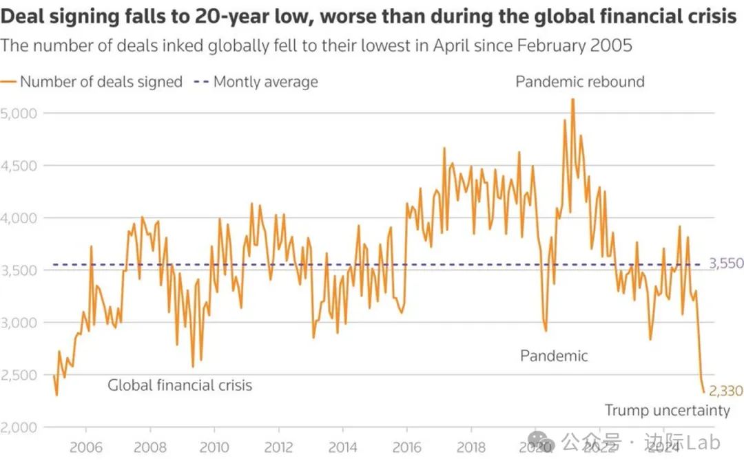 受地缘政治与白宫政策不确定性拖累,企业信心和跨境交易意愿明显下滑,全球并购交易签署数量在2025年4月跌至2,330宗,为2005年2月以来最低。