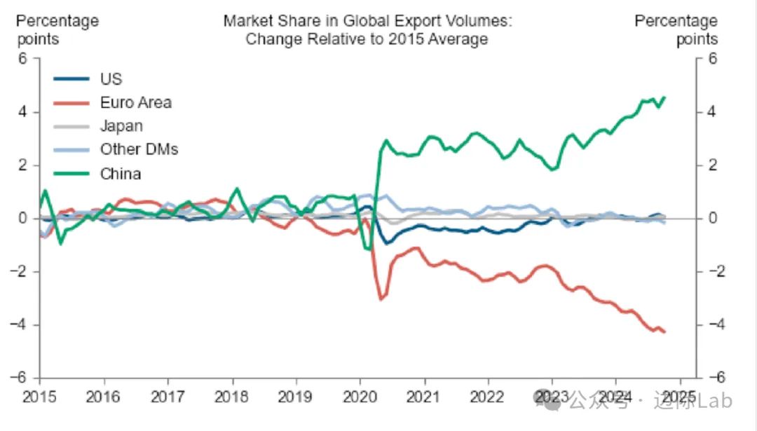 1.当前,中国在全球出口中的市场份额已较疫情前的均值上升约5个百分点,凸显了在后疫情时代,中国进一步巩固了全球制造和供应链的主导地位。另一方面,这一上升几乎全部对应了欧元区出口份额的下降。