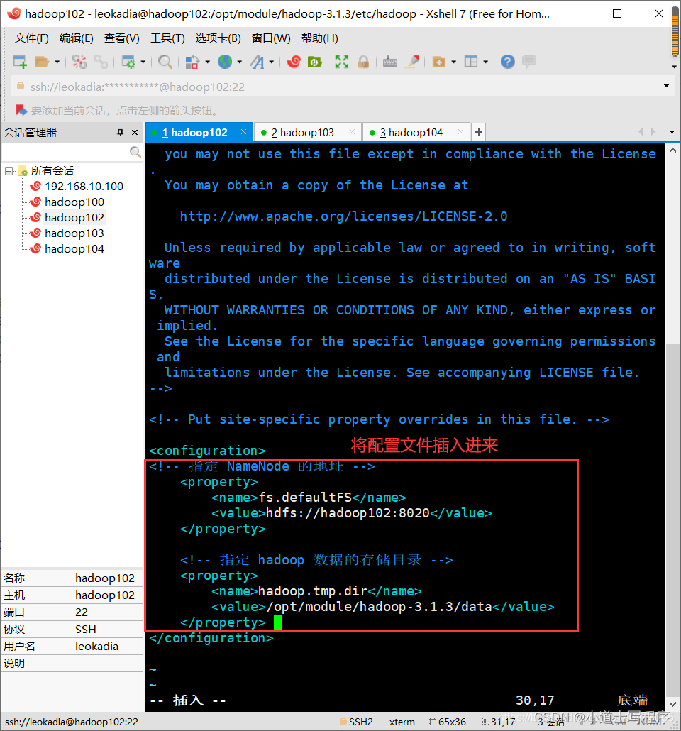 [leokadia@hadoop102 hadoop]$ vim core-site.xml