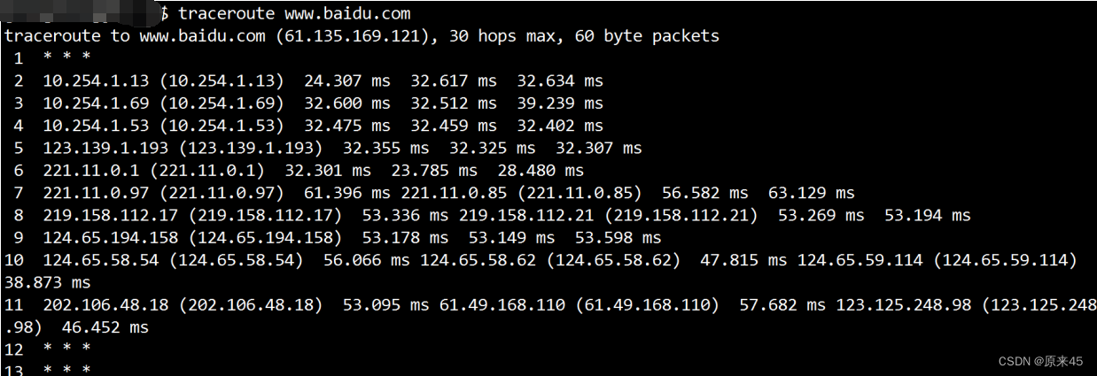 也是基于ICMP协议实现, 能够打印出可执行程序主机, 一直到目标主机之前经历多少路由器.![]()