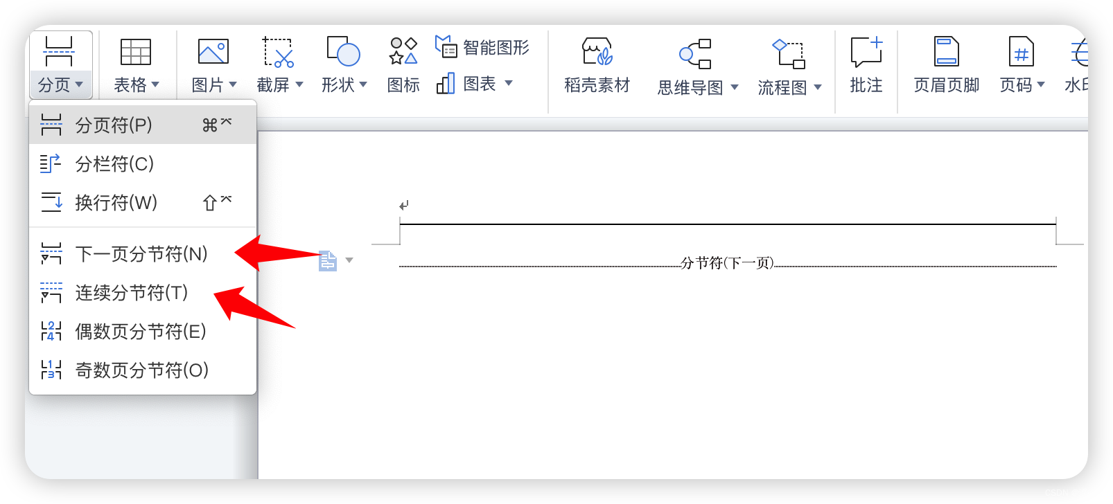 注:如果不希望产生下一页,希望紧跟文本那就选择连续分节符
