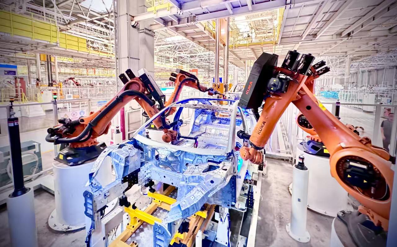工厂内的焊接车间采用高度柔性化生产布局,可支持6款车型(主线扩展至8款)共线生产,最大可覆盖5000×2000×1700mm的车身尺寸,适配轿车、SUV、MPV、旅行车等多种车型,并具备钢铝混合、全钢、全铝车身的制造能力。作为行业首条支持6车型钢铝混线生产的智能化产线,其先进的工艺技术有效拓宽了产品型谱,满足多样化市场需求。