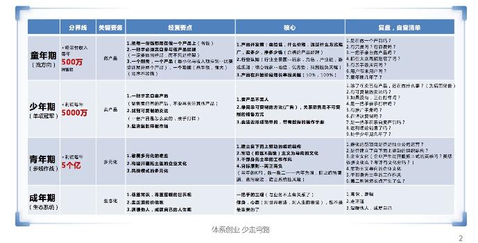 如果将创业企业划分为四个阶段,每个阶段都有不同的目标:童年期,企业需聚焦打造一款产品,实现商业模式闭环以存活;少年期,要实现可复制的产品销售,突破营业额 500 万门槛,向利润 5000 万迈进;青年期,不能仅依赖单一爆品,需推进产品多元化;成年期,则要构建行业生态,在行业中拥有话语权并制定规则,目标是实现 5 亿利润。