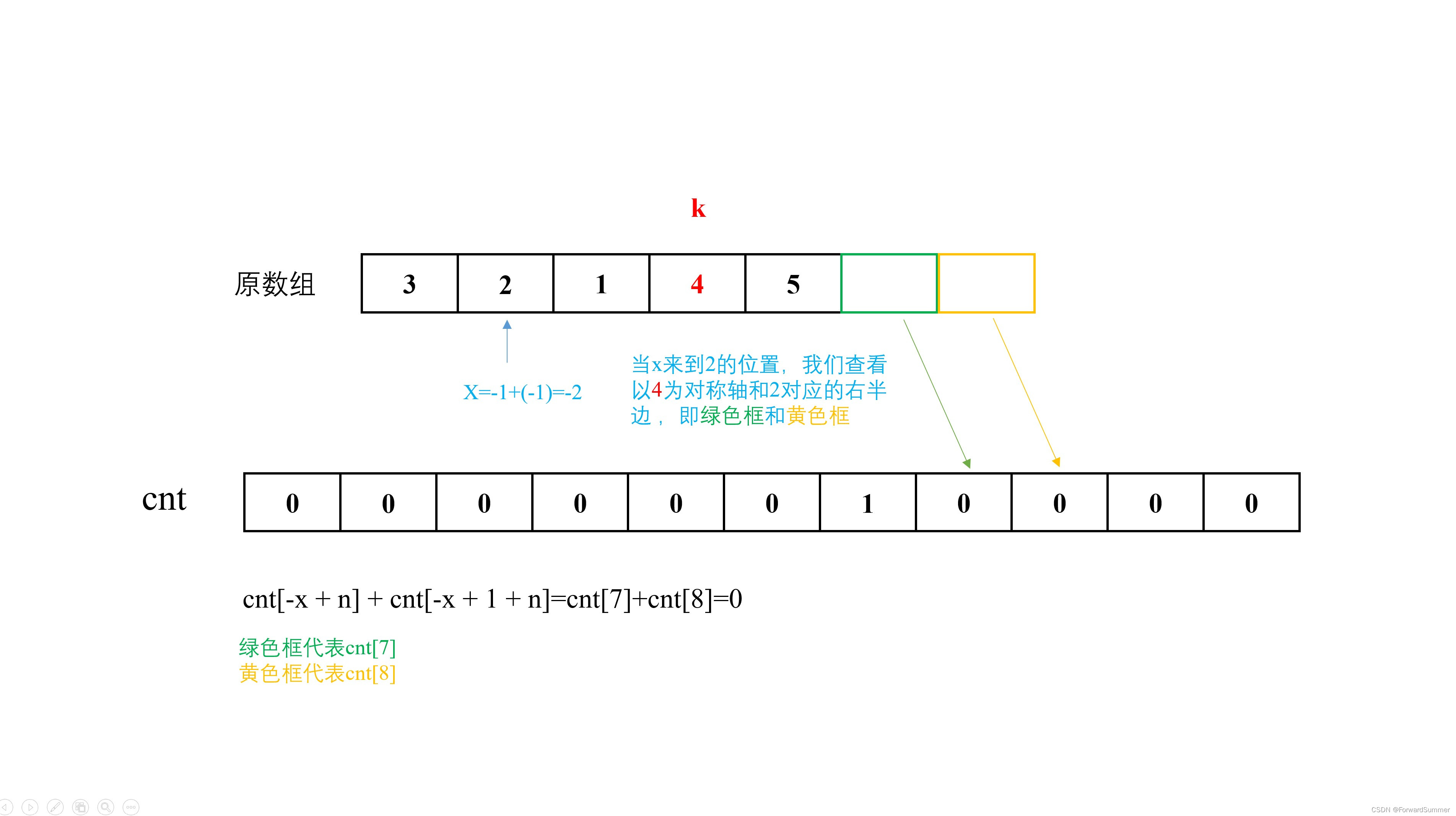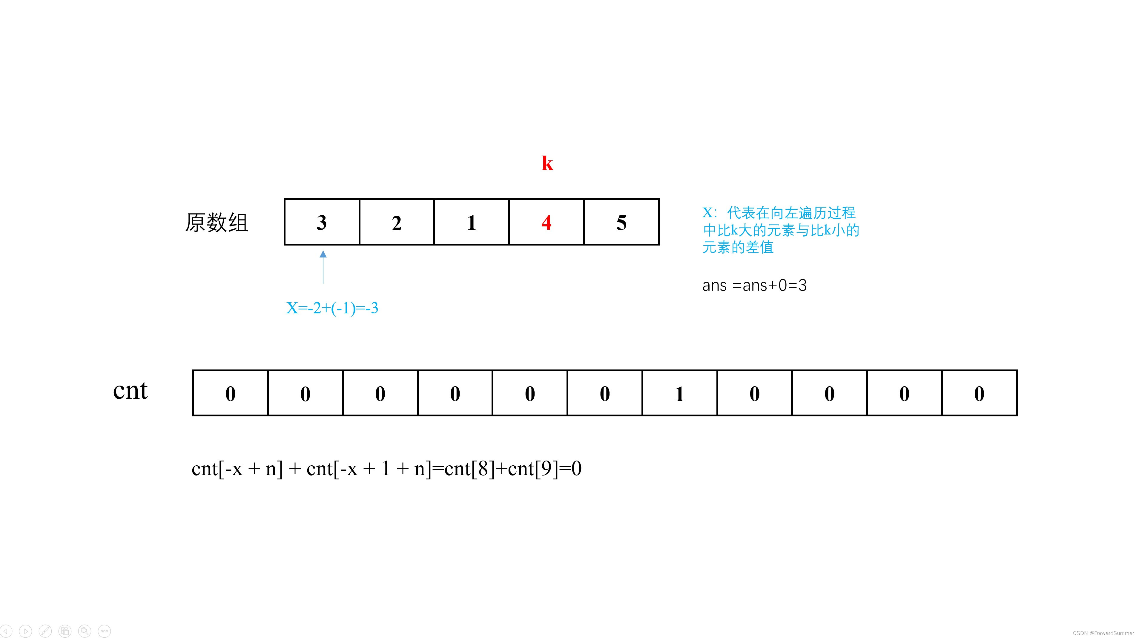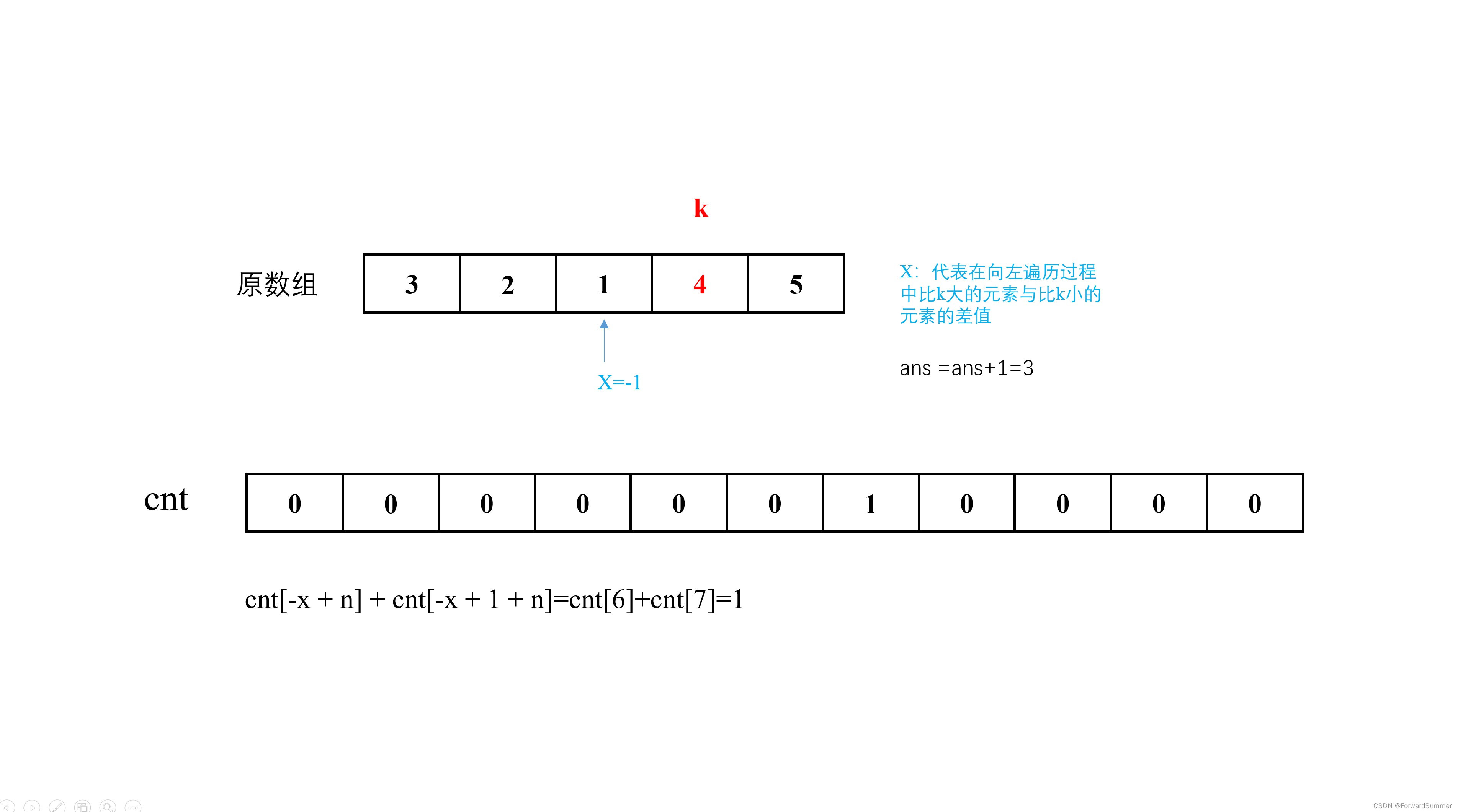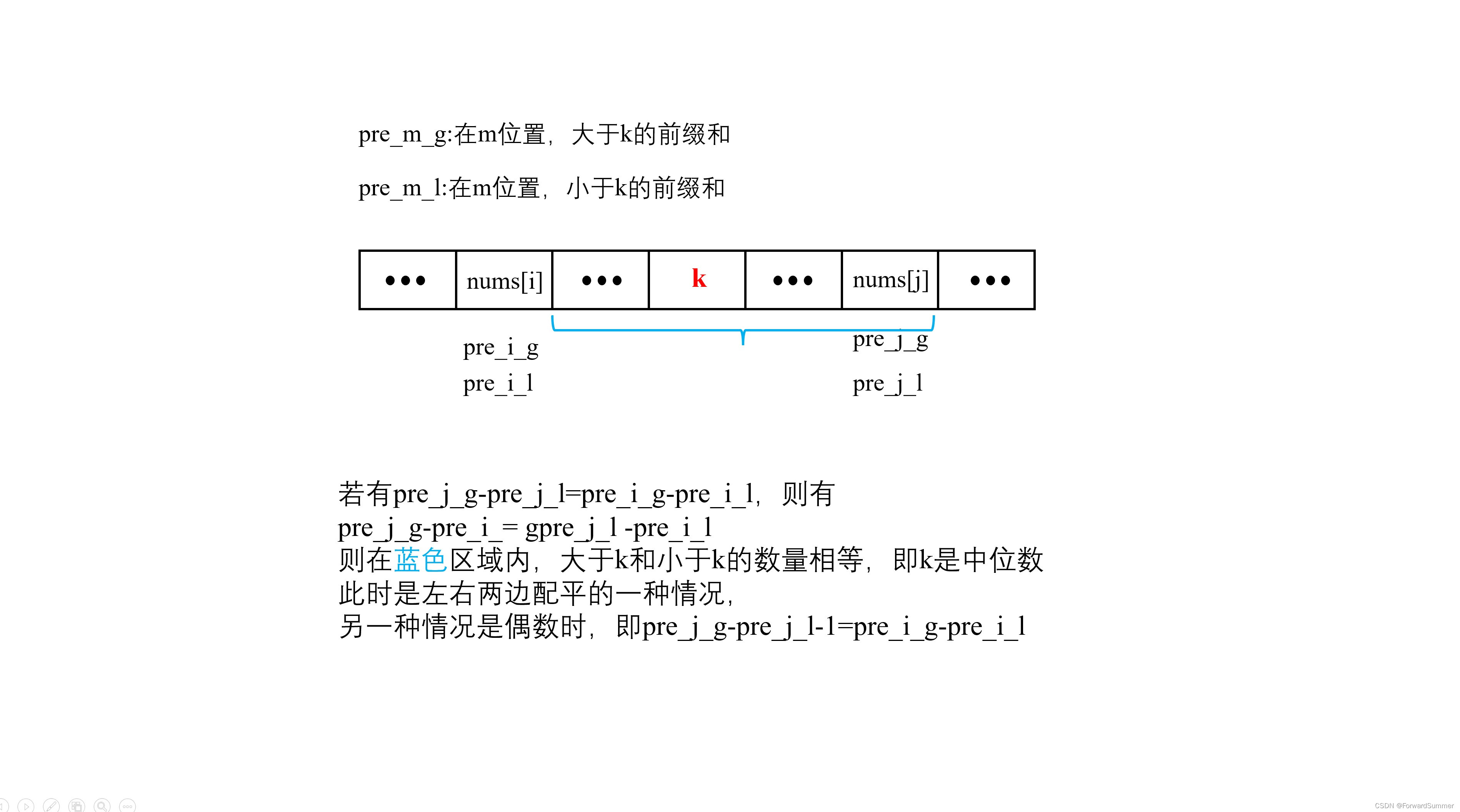 【2】:“在编码上,我们可以直接开一个长度为2*n+1的数组,用于统计当前数组中,比k大的个数和比k小的个数的差值,加上n即可把范围从[-n,n]传换成[0,2n]”