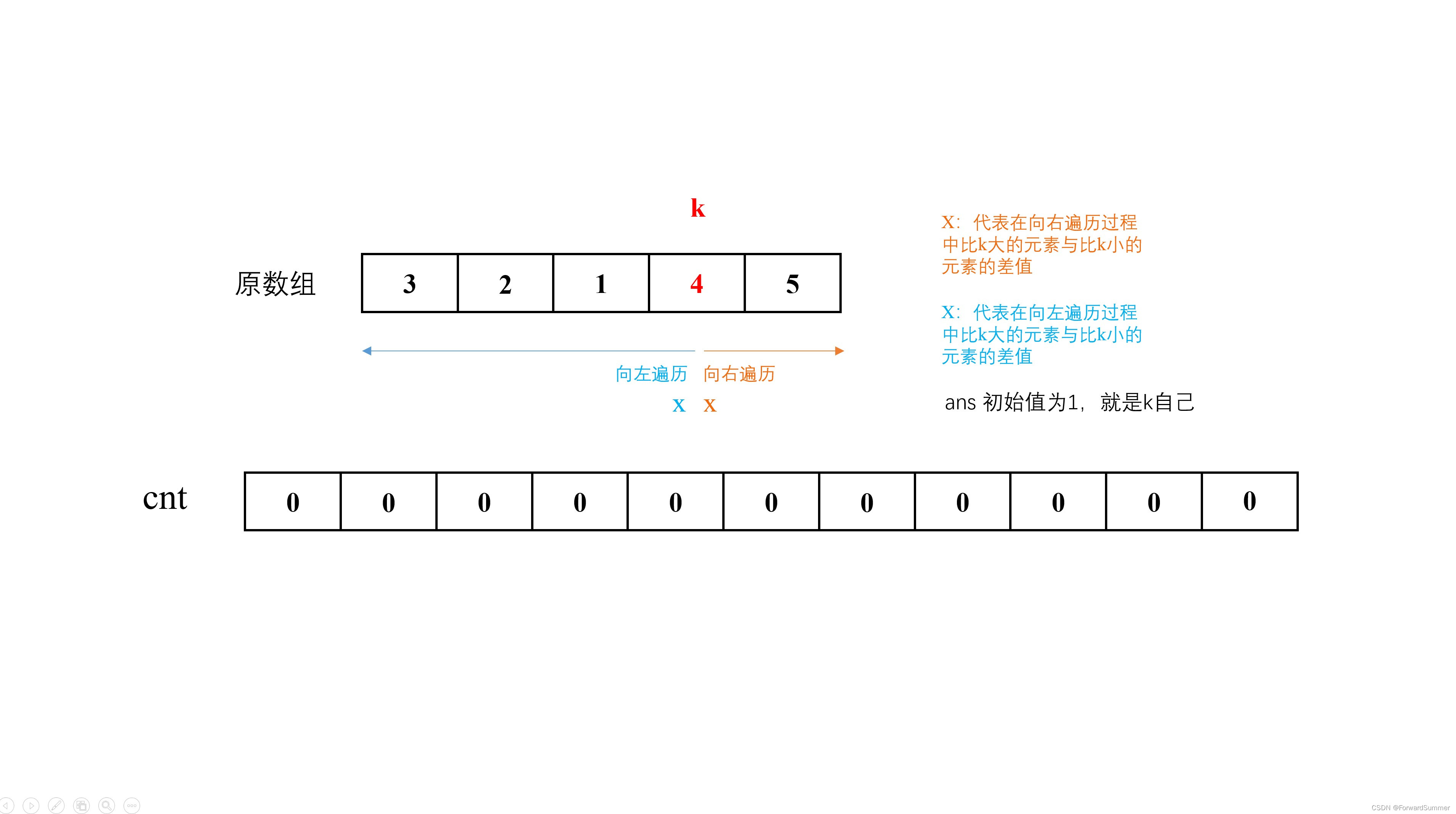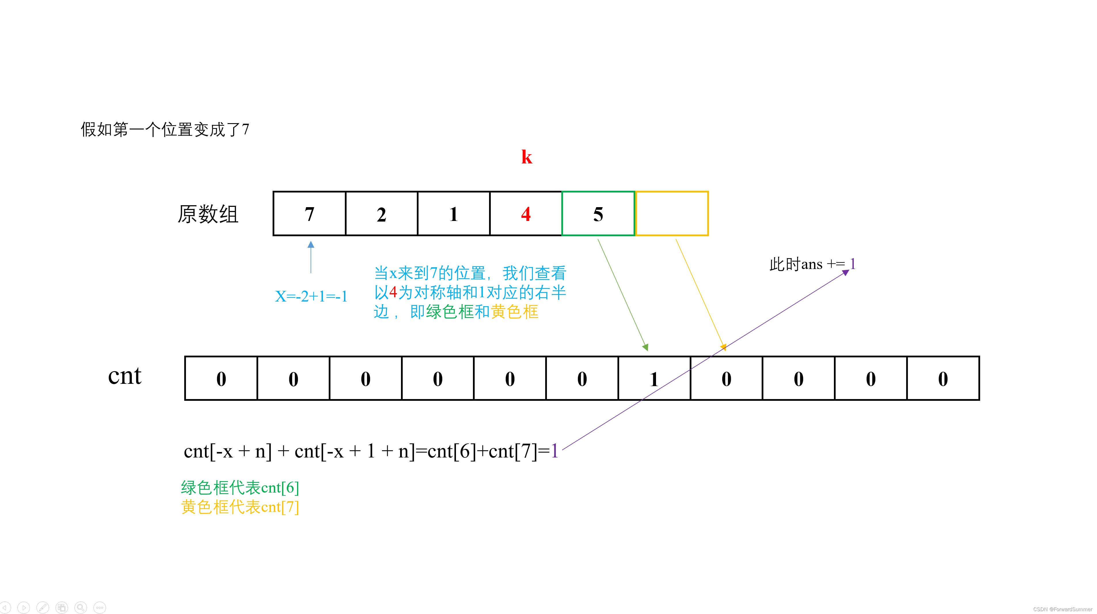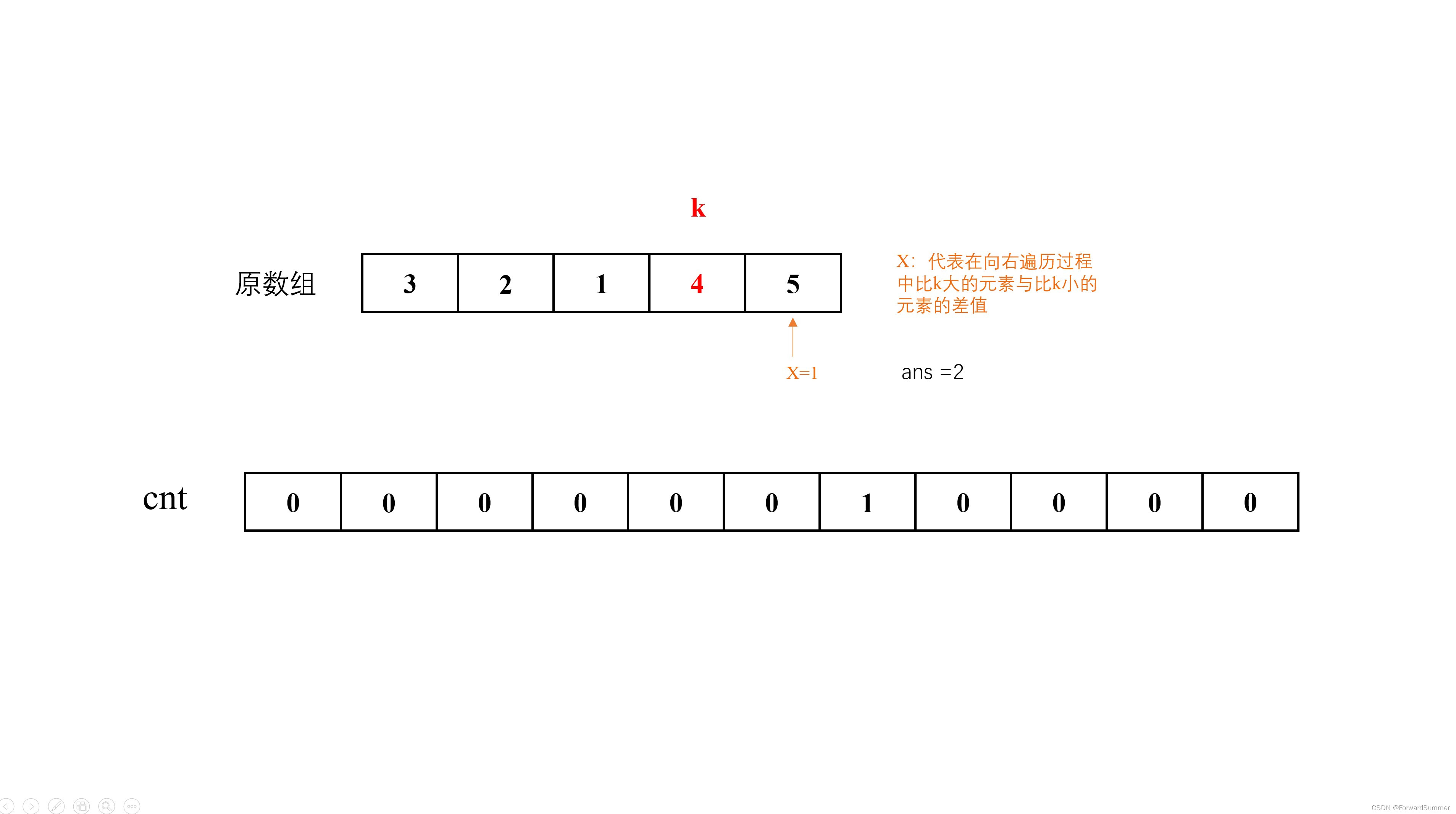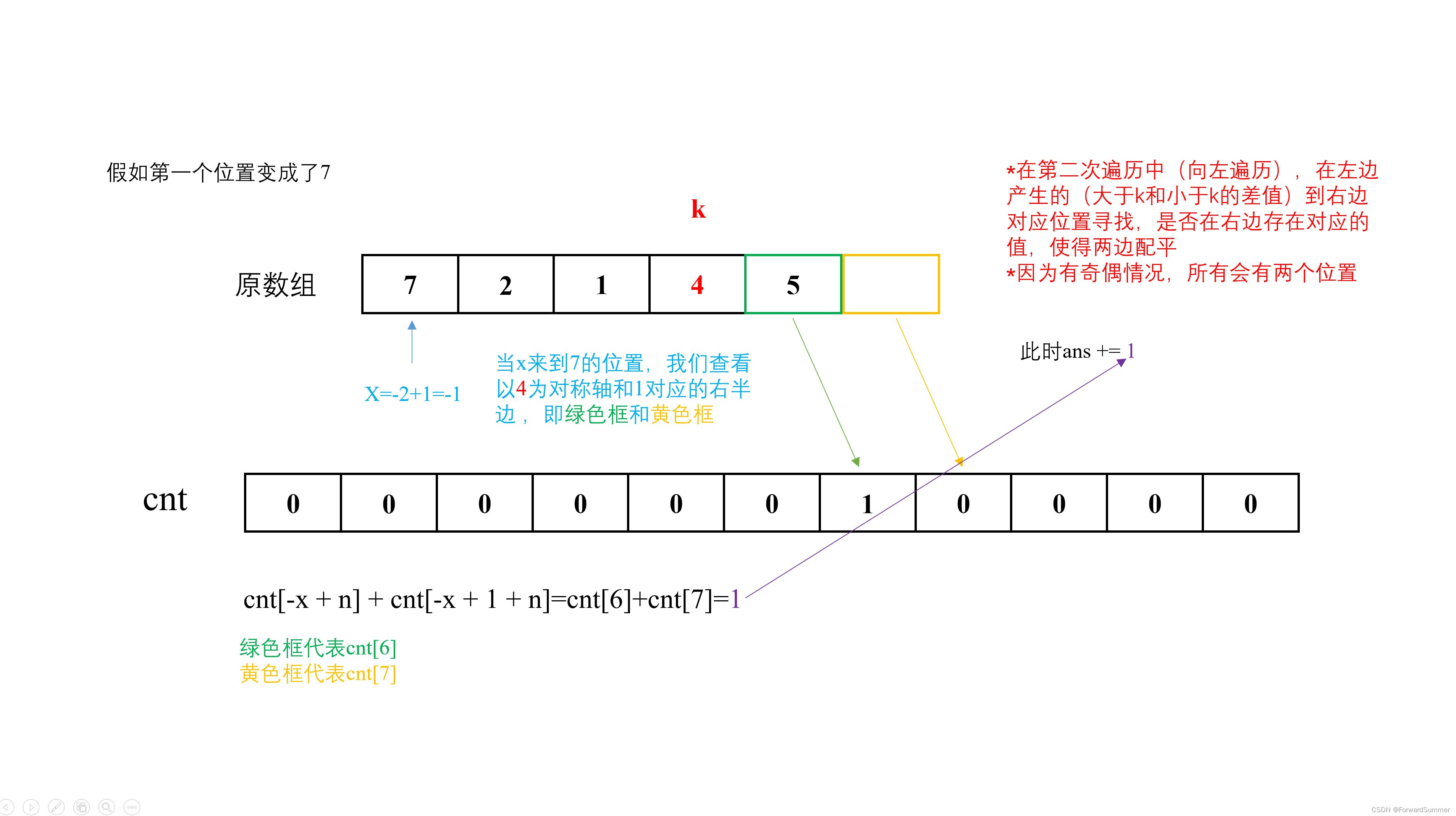 【2】:“在编码上,我们可以直接开一个长度为2*n+1的数组,用于统计当前数组中,比k大的个数和比k小的个数的差值,加上n即可把范围从[-n,n]传换成[0,2n]”