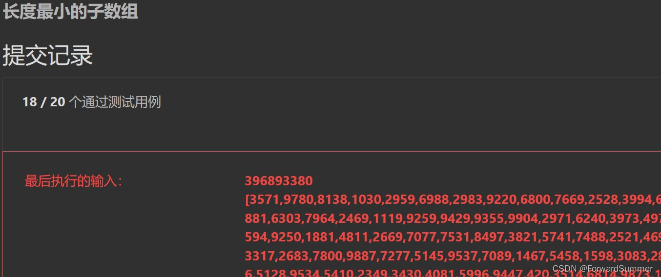 class Solution {public int minSubArrayLen(int t, int[] nums) {int n = nums.length, ans = n + 10;int[] sum = new int[n + 10];for (int i = 1; i <= n; i++) sum[i] = sum[i - 1] + nums[i - 1];for (int i = 1; i <= n; i++) {int s = sum[i], d = s - t;int l = 0, r = i;while (l < r) {int mid = l + r + 1 >> 1;if (sum[mid] <= d) l = mid;else r = mid - 1;}if (sum[r] <= d) ans = Math.min(ans, i - r);}return ans == n + 10 ? 0 : ans;}