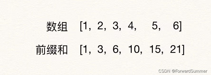 对于数组nums来说,前缀和pre[i] = pre[i-1] + nums[i],即每个位置上存储的是前i个数组元素的和,用数学公式表示为: