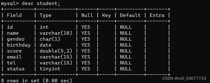 需求:设计一张学生表,请注重数据类型、长度的合理性