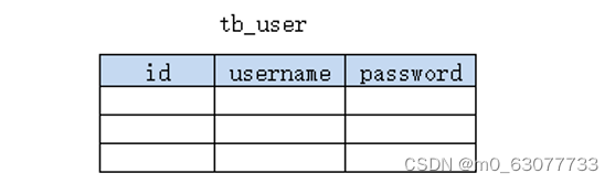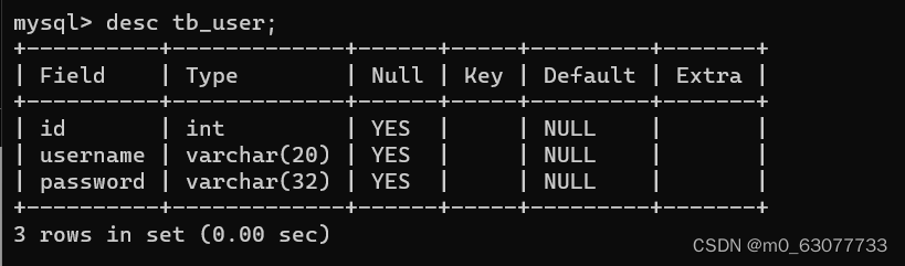 create table tb_user (id int,username varchar(20),password varchar(32)