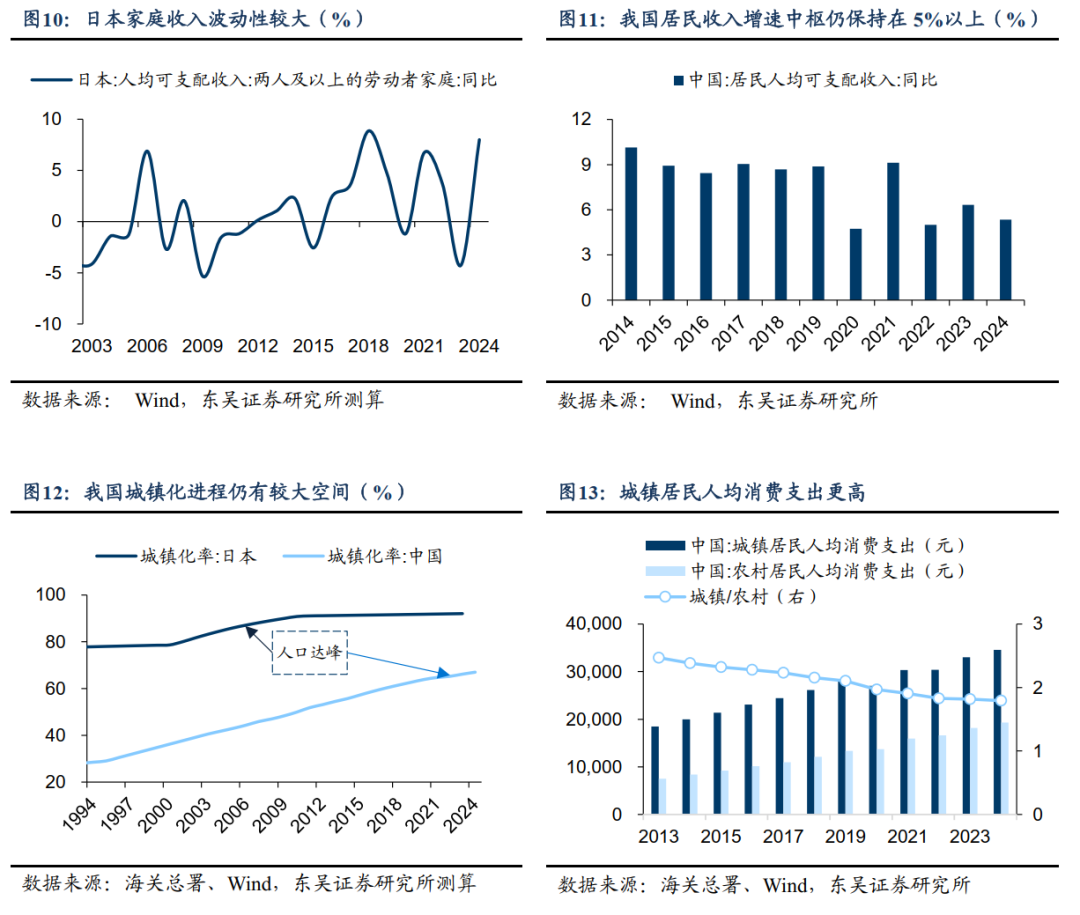 其一,从决定消费水平的核心因素居民收入来看,自20世纪90年代初日本房地产泡沫破裂以来,日本家庭可支配收入长期以较低速度增长,而进入人口负增长时家庭人均可支配收入增速甚至经历了一段时间的负增长。而我国在2022年后,居民人均可支配收入仍以5%以上的中枢平稳增长,居民收入的持续增长为消费的平稳增长提供了坚实的经济基础;