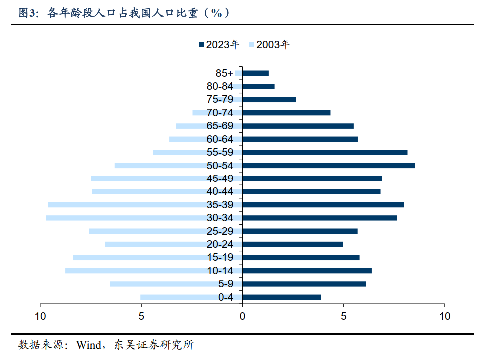 而从人口年龄分布来看,截至2023年底,50-60岁年龄段人口已成为目前我国人口构成的主要组成部分,但值得注意的是,现阶段我国老年人口整体仍相对低龄,在护理、旅游等服务消费领域有较强诉求,未来5-10年或是我国发展银发经济的重要窗口期。