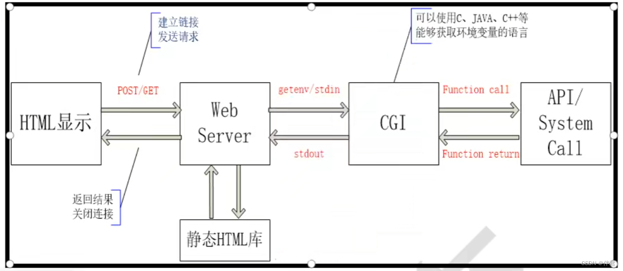 (1)CGI程序通过标准输入(stdin)、标准输入(stdout)实现与web服务器信息的传递;