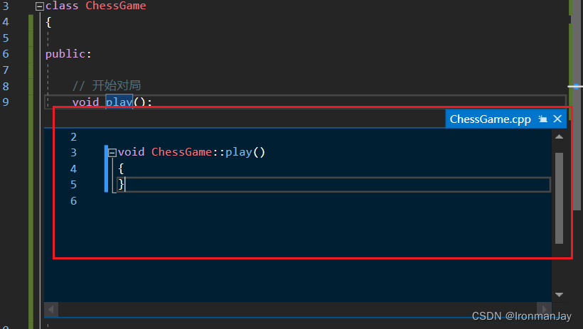 {public:ChessGame(Man*, AI*, Chess*);// 开始对局void play();// 添加数据成员
