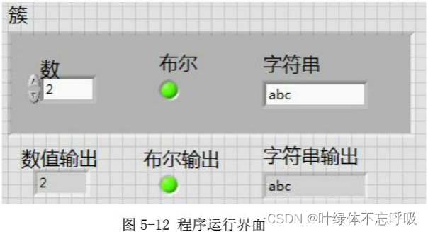 执行“连续运行”。在簇数据中改变数值大小、单击布尔指示灯、输入字符串,数值输出值、布尔输出值、字符串输出值发生同样的变化。