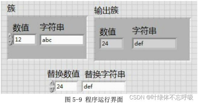 执行“连续运行”。在簇数据中改变数值大小,输入1个字符串;改变替换数值大小,在替换字符串中输入另一个字符串,输出簇中数值和字符串发生相应变化(被替换)。