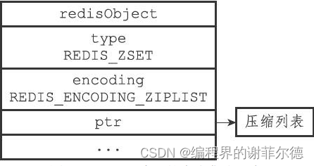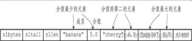 ziplist编码的压缩列表对象使用压缩列表作为底层实现,每个集合 元素使用两个紧挨在一起的压缩列表节点来保存,第一个节点保存元素 的成员(member),而第二个元素则保存元素的分值(score)