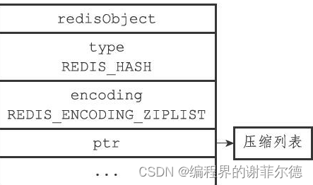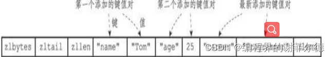 ziplist编码的哈希对象使用压缩列表作为底层实现,每当有新的键 值对要加入到哈希对象时,程序会先将保存了键的压缩列表节点推入到 压缩列表表尾,然后再将保存了值的压缩列表节点推入到压缩列表表尾,
