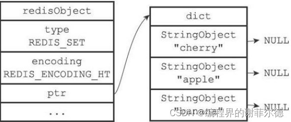hashtable编码的集合对象使用字典作为底层实现,字典 的每个键都是一个字符串对象,每个字符串对象包含了一个集合元素, 而字典的值则全部被设置为NULL