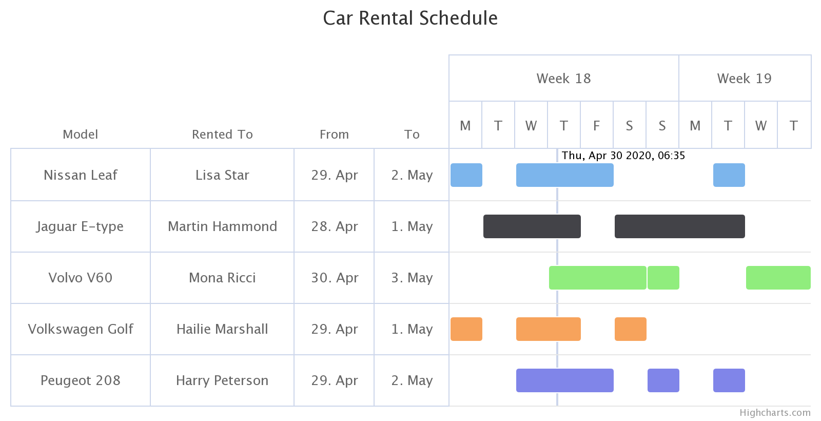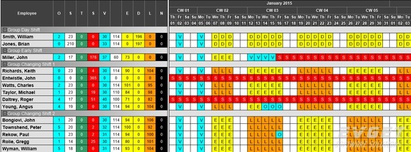 员工信息及其部署可通过甘特图显示。VARCHART XGantt可使你通过日历功能预先设置的进度条的长度,并添加计划相关的信息,例如夜班或早班,每班必需的员工数量等。在甘特图中的排班和人力资源规划表几乎没有任何可视化限制。