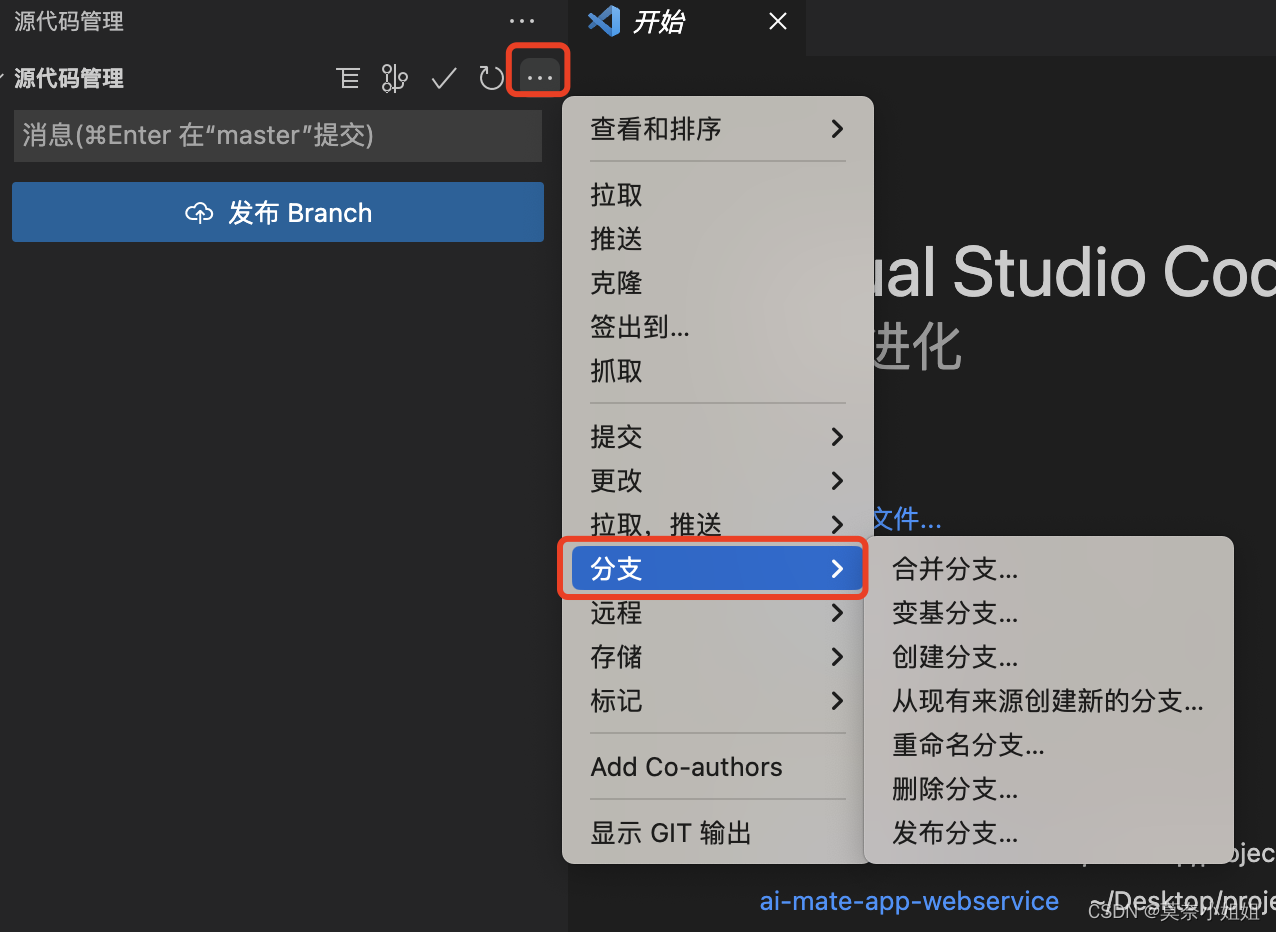 在软件左下角可以看到当前分支的名字,点击名字,可以快捷创建分支。