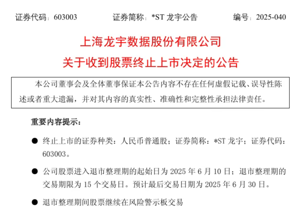 *ST龙宇(603003)也公告,公司于2025年5月30日收到上海证券交易所出具的自律监管决定书,决定终止公司股票上市。终止上市的证券种类为人民币普通股,证券简称为*ST龙宇,证券代码为603003。