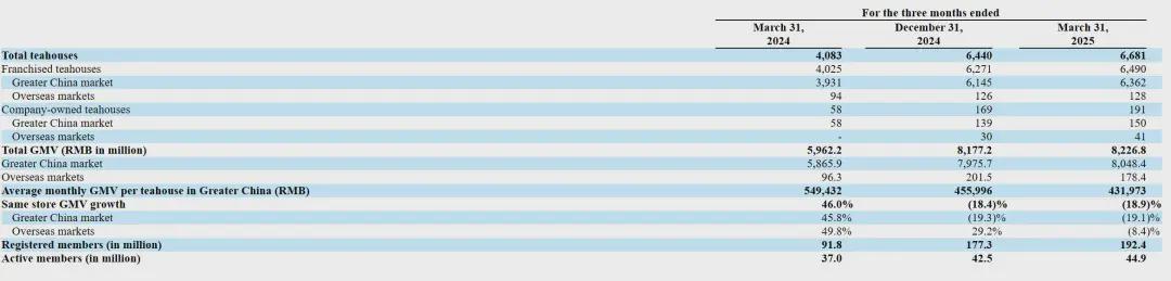 可伴随着门店的加密,霸王茶姬已经看到了天花板。大中华地区门店的单店月均GMV从2024年Q1的54.9万元降至2025年Q1的43.2万元,5个季度的累计降幅达21%,同店GMV增长率则由正转负,从2024年一季度末的46%跌至2025年一季度末的-18.9%。