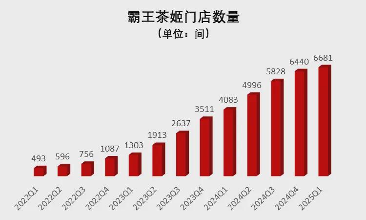 2021年,霸王茶姬完成了样板市场的建设。从2022年开始,其门店扩张速度开始以季度计。2024年底,霸王茶姬的门店数量达到6440家,远超喜茶(约4400家)、奈雪的茶(约1800家)。到了2025年一季度末,其全球门店数又升至6681家,同比增长63.6%。